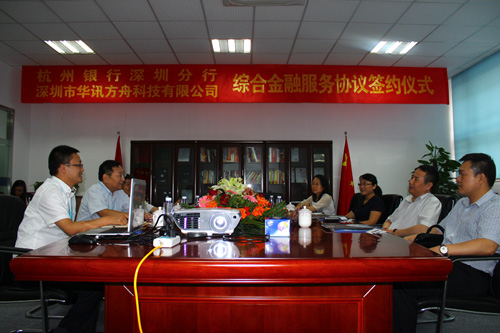 7月25日,杭州銀行深圳分行與華訊方舟的綜合金融服務(wù)協(xié)議簽約儀式在集團總部舉行,杭州銀行深圳分行行長冷文廣及其代表,華訊方舟總裁黃永江、副總裁Sunny等領(lǐng)導(dǎo)共同出席了簽